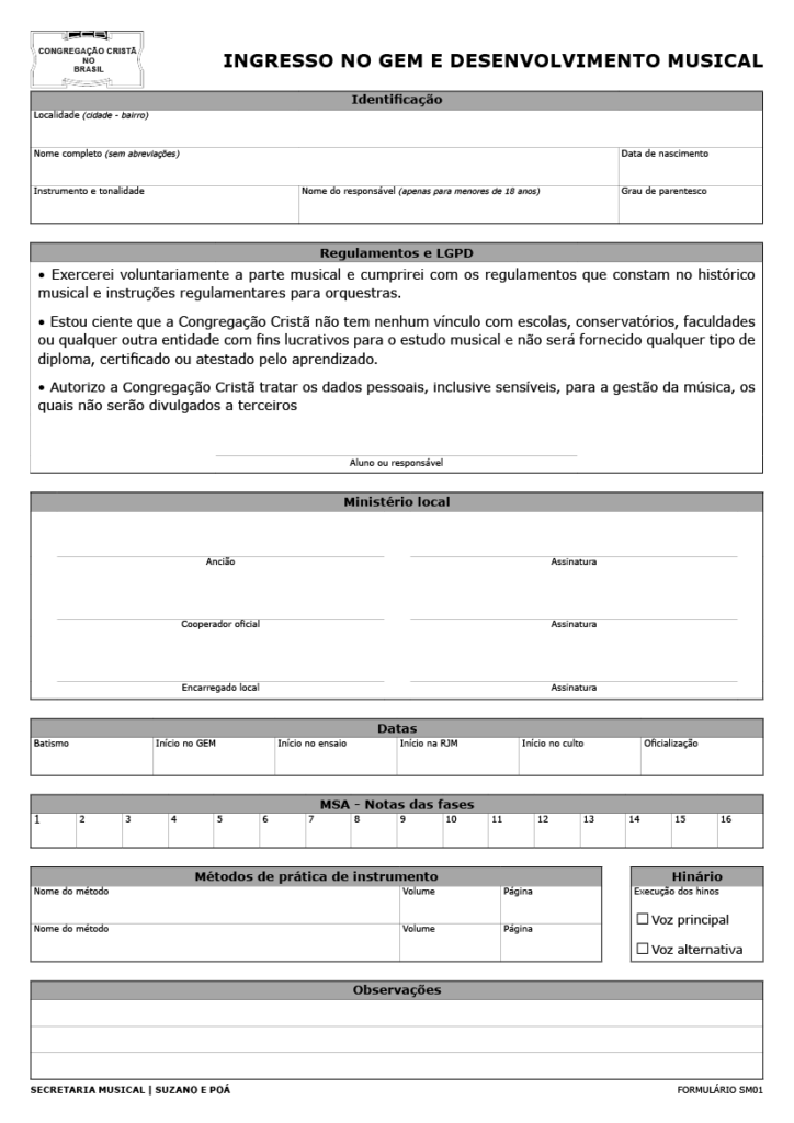 Este formulário deve ser preenchido quando um irmão deseja entrar no GEM para o estudo musical. Iniciar os estudos após a assinatura do ministério local.
